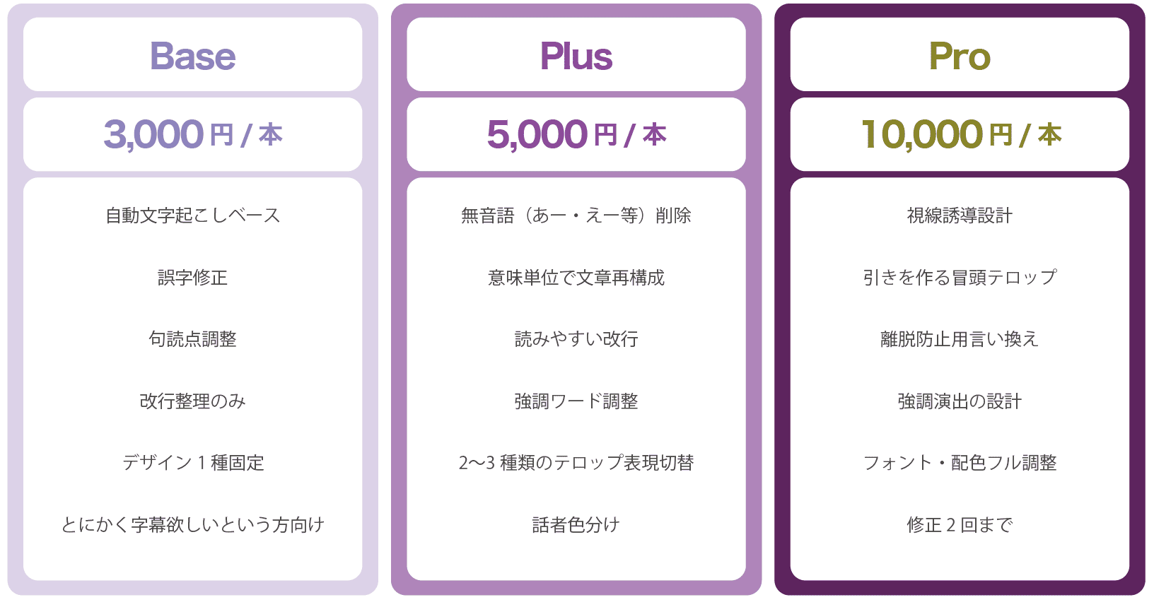 「Base / Plus / Pro」の各プランでは、価格に応じてテロップの編集密度・演出量・視線誘導の設計レベルが段階的に変わります。