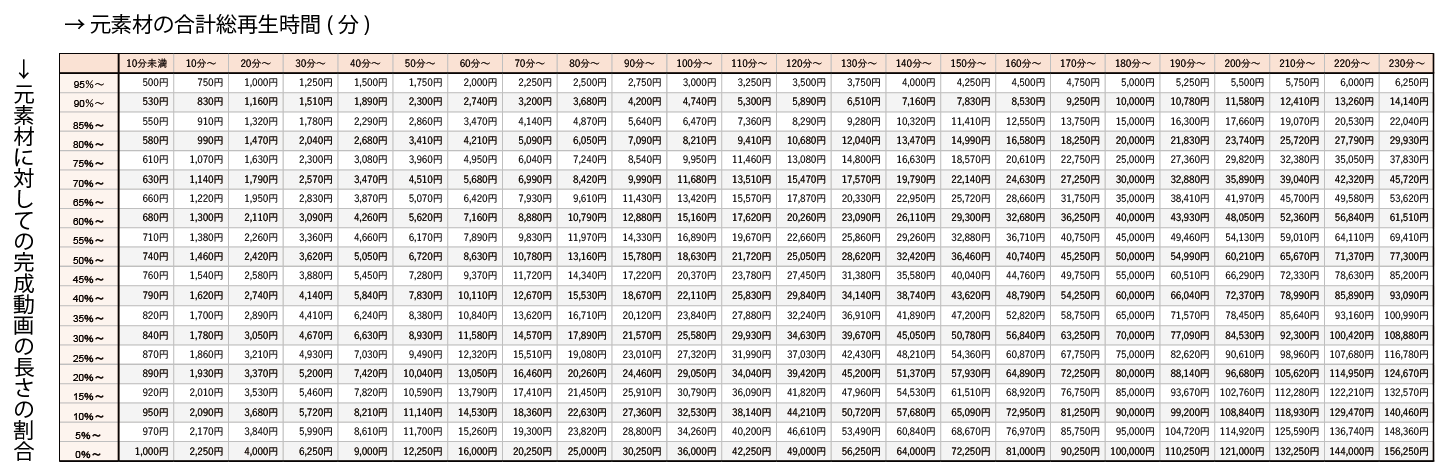 ② 「元素材の合計総再生時間」と「元素材に対しての完成動画の長さの割合」を【価格表】に照らし合わせる